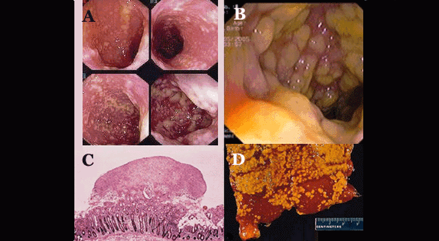 Главным признаком классического псевдомембранозного колита служит диарея. Стул больного становится водянистым, частым, не содержит кровь и выделяется малыми порциями. Также наблюдается приступообразная боль в животе, общая слабость, тошнота и беспричинная потеря веса. При прогрессировании патологии происходит присоединение системных поражений, которые проявляются следующим образом: