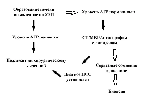 У пациента без цирроза, когда обычно первичной находкой является образование печени, начальным диагностическим тестом должно быть определение уровня АFP. Его повышение, при отсутствии первичной опухоли яичек, подтверждает диагноз. Если опухоль потенциально операбельна, то может потребоваться биопсия печени вне опухоли для определения дальнейшей тактики. Если уровень AFP нормальный, то поиск других причин (внепеченочная первичная опухоль) и дальнейшее радиологическое обследование являются оправданными. Если результаты обследования указывают на НСС, биопсия печени вне опухоли поможет определению типа планируемой операции. Радиологические исследования могут исключить доброкачественное поражение печени с большим уровнем чувствительности и специфичности [51, 52, 54]. Только в ситуациях, когда существует высокий уровень сомнений в диагнозе, показана биопсия опухоли.