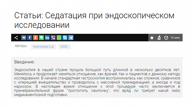Все больше сторонников завоевывает использование для седатации пропофола, анальгетика короткого действия с быстрым началом и прекращением действия. Выключение сознания достигается через 30 секунд после введения, вводить препарат можно как болюсно, так и капельно. Время восстановления не превышает 10-20 минут [9]. Проблемами его использования остается малый терапевтический интервал, риск дыхательной депрессии и сердечно-сосудистых расстройств. Существует много исследований описывающих положительно оценивающих результат данного препарата с целью седатации при гастроскопии и колоноскопии [3, 5].