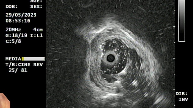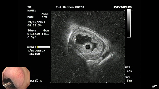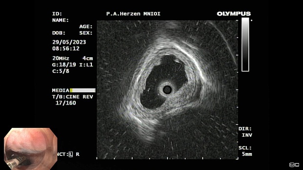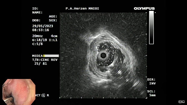 Согласно полученным данным - в среднегрудном и нижнегрудном отделах пищевода определялась проксимальная граница плоских неправильной формы поверхностных рубцов суммарной протяженностью до 8,0 см. На этом фоне в зонах поверхностных рубцов по задней полуокружности визуализировались участки гиперпигментации в темный цвет (Рис. 1). При исследовании в режиме Dual Focus было отмечено наличие мелких (до 0,001 см) черно-коричневых включений, расположенных субэпителиально - в строме слизистой оболочки, сливания их в единый конгломерат не определялось (Рис. 2). При эндосонографии с применением минидатчика с частотой сканирования 20МГц выявлено, что все слои стенки четко дифференцируются, не утолщены, в слизистой оболочки визуализированы мелких гиперэхогенные включения с эхотенями (Рис. 3).