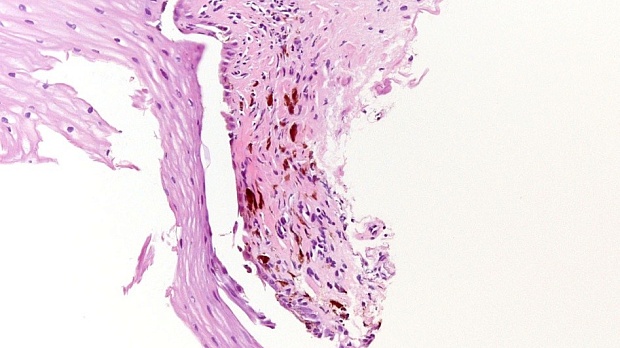 Эндоскопическое заключение было подтверждено данными патоморфологического исследования, согласно которому, в биоптате слизистой оболочки пищевода были обнаружены фрагменты поверхностных отделов слизистой оболочки, в субэпителиальной соединительной ткани которых обнаруживаются немногочисленные клетки с бурым пигментом в цитоплазме – картина сидероза (Рис.4)