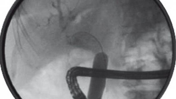 УЗИ брюшной полости выявило расширение внутри- и внепеченочных желчных протоков. Для обеспечения эндоскопического доступа к большому дуоденальному сосочку и купирования обструкции желчных путей была выполнена лапароскопическая гастростомия исключенного из пассажа пищи желудка. Через неделю после вмешательства проведена эндоскопическая ретроградная холангиопанкреатография.