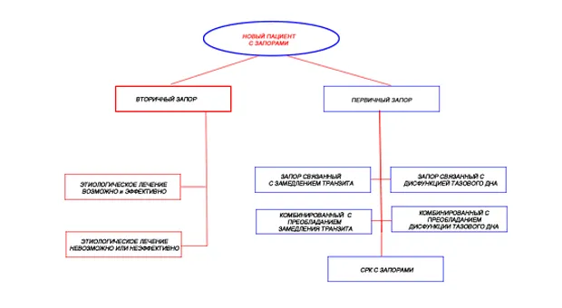 На основании жалоб, сбора анамнеза и физикального обследования пациент с запорами должен быть отнесен в одну из 4 групп: