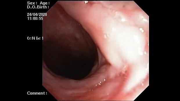 Во время видеоэзофагоскопии определяется: от 20 см до 21 см от резцов на 8 ч.у.ц. свищевое отверстие до 7 мм, слизистая оболочка гладкая, блестящая.
