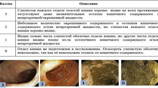 Количественная 4-балльная система ( 0, 1, 2, 3) оценки подготовки проводится по трем сегментам: правые отделы толстой кишки (слепая и восходящая ободочная кишка), средние отделы (поперечно-ободочная кишка, включая печеночный и селезеночный изгибы) и левые отделы (нисходящая и сигмовидная ободочная кишка, прямая кишка).